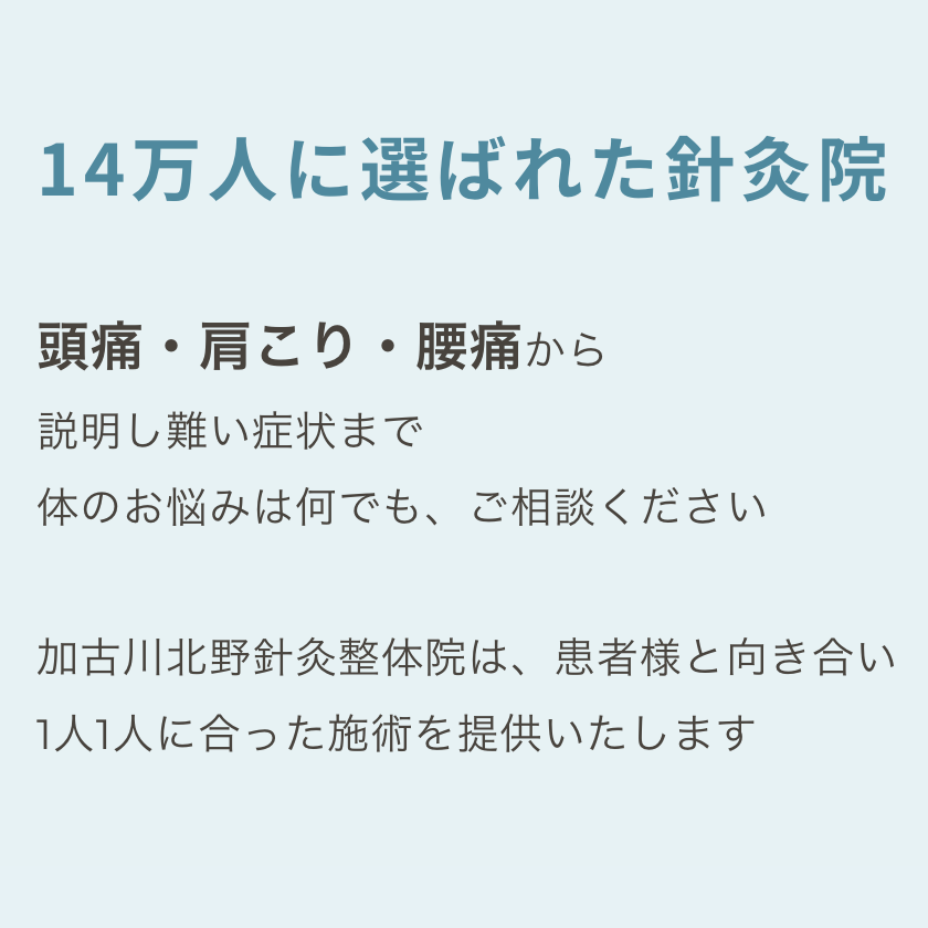 14万人に選ばれた針灸院 頭痛・肩こり・腰痛から 説明し難い症状まで 体のお悩みは何でも、ご相談ください 加古川北野針灸整体院は、患者様と向き合い 1人1人に合った施術を提供いたします Instagram Instagram こんなお悩みありませんか? こんなお悩みありませんか? 頭痛 腰痛 姿勢 スポーツ障害 美容 自律神経 施術メニュー 針灸治療 姿勢矯正 全身整体 小顔矯正 産後矯正 リンパドレナージュ パーソナルトレーニング 食事指導 パーソナルトレーニング 食事指導 お知らせ 2025年4月18日 ゴールデンウィーク期間中も施術します 2024年12月13日 年末年始も施術します 2024年7月31日 お盆期間中も施術します 2024年4月17日 ゴールデンウィーク期間中も施術します 2023年12月27日 年末年始も施術します アクセス 〒675-0011 兵庫県加古川市野口町北野1022-1 ※周辺には「ヤマダストアー北野店」「焼き肉つわなぎ」さんがあります。 営業時間 ・朝 6:00-10:00 ・昼 12:00-26:00 (初診:12:00~21:00) ・不定休 お電話かLINEでご予約・お問い合わせください ■お電話 予約受付時間:12:00~18:00 070-5432-9100 ■ LINE 予約受付時間:12:00~26:00 LINEでもご予約できます Twitter Instagram Blog Twitter Instagram Blog