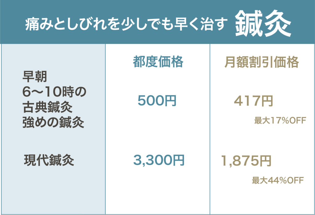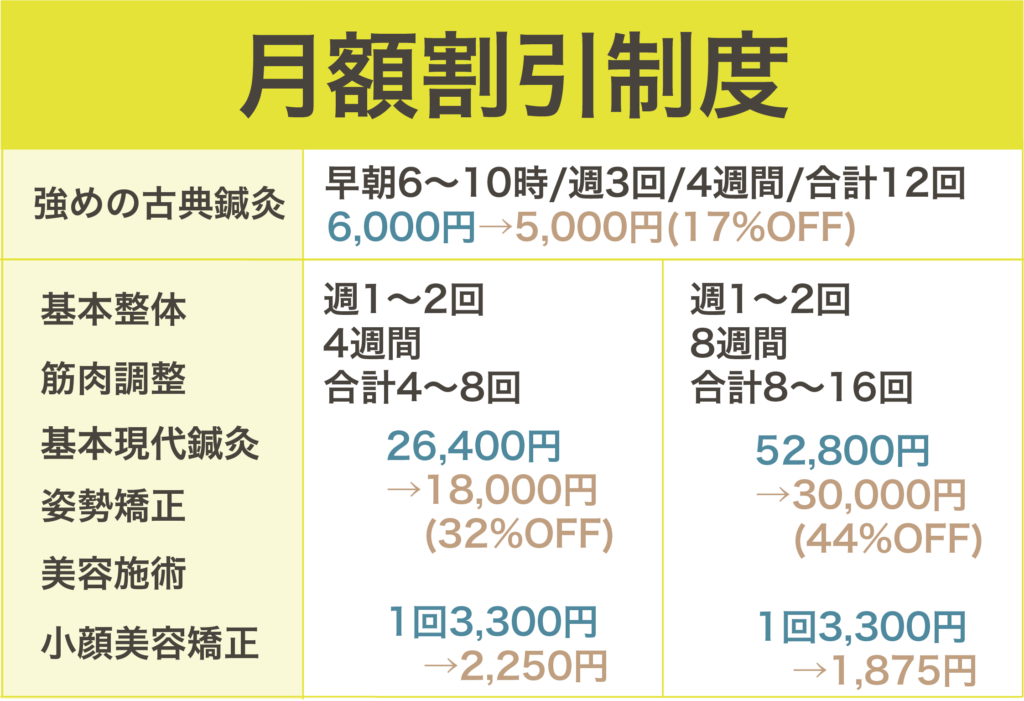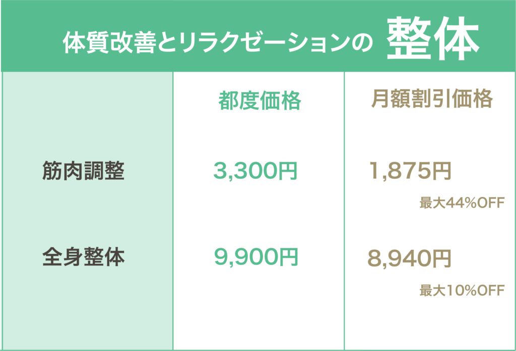 業界平均価格は【初診5000〜1万円/継続3,800〜4,400円】ですが、 当院では通いやすい価格にして症状の改善を目指しています。