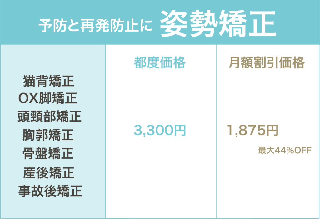 姿勢矯正では肩こりや腰痛など、姿勢の悪さからくるカラダの不調を治すために良い姿勢へと調整していきます。