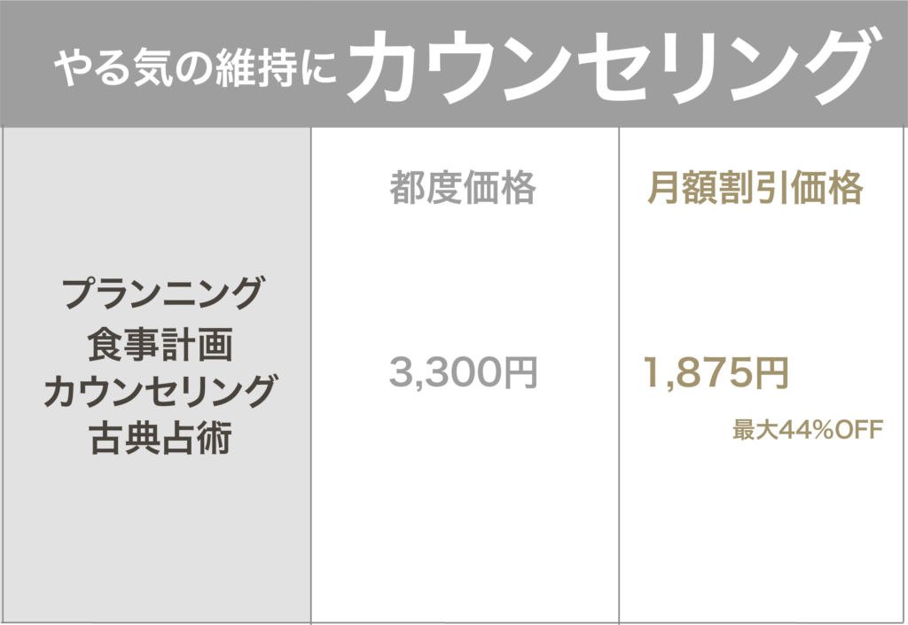 ご自身の身体の不調や理想の体型などを丁寧にヒアリングし、整体等のアプローチ+食事指導で内側からの健康維持を目指します。